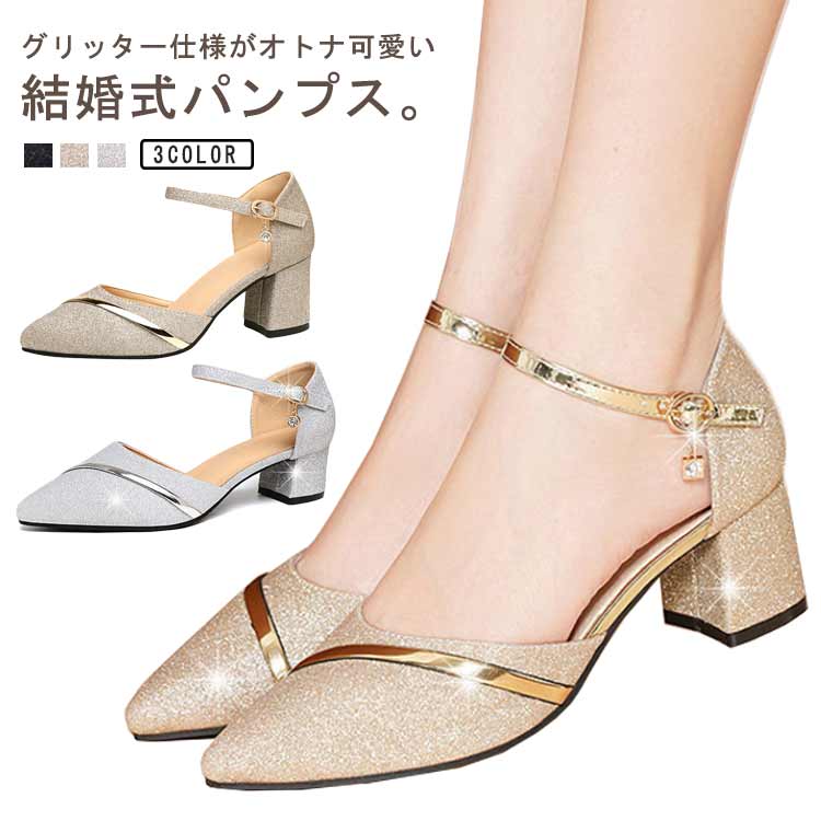 パンプス きれいめ キラキラ大人可愛い ラメ フォーマル 靴 グリッター シューズ チャンキーヒール