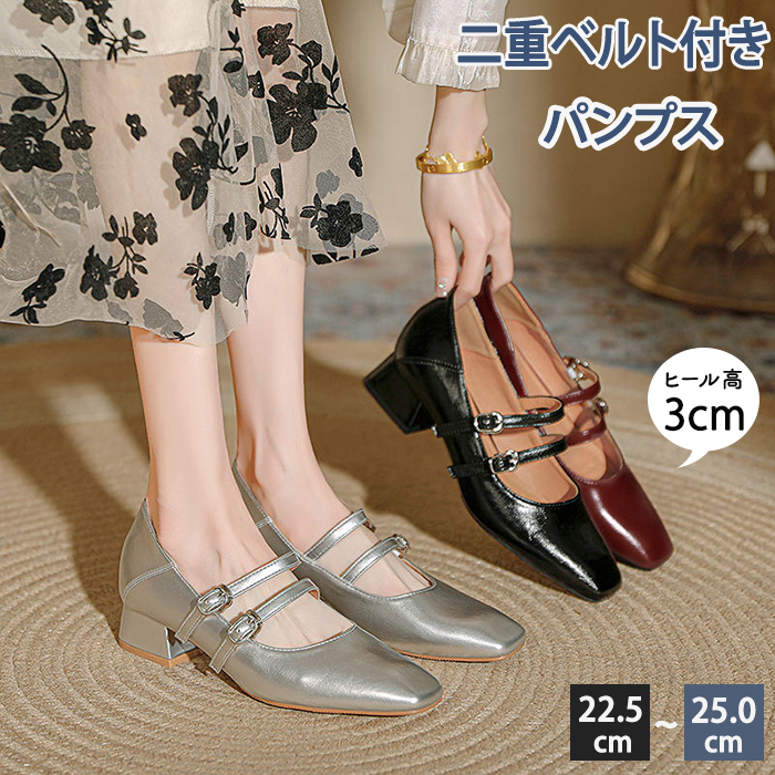 ンプス レディース 甲浅 美脚効果 ローヒール 太ヒール シンプルパンプス 二重ストラップパンプス フォーマル 履きやすい 安定感のある太パンプス 大人 通勤 二次会 発表会 結婚式
