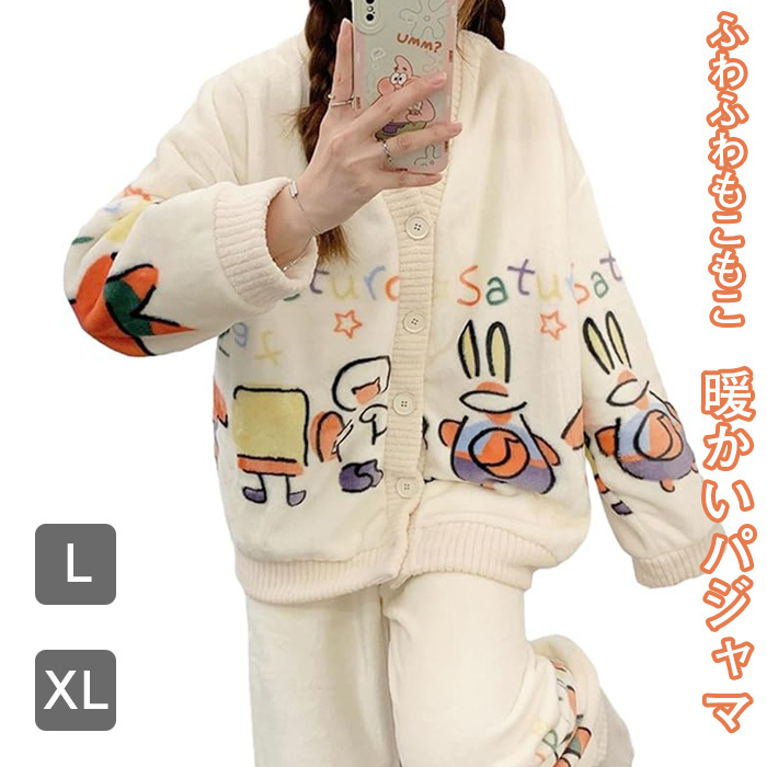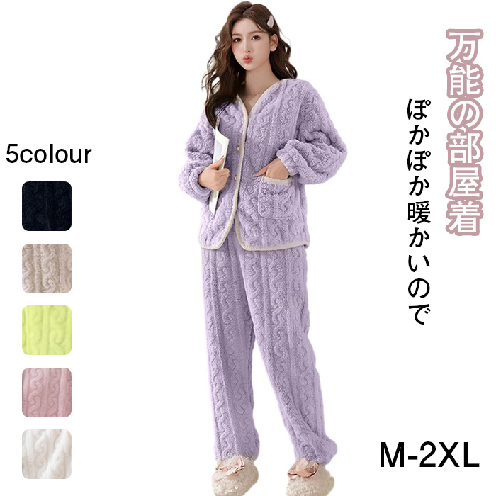 パジャマ 前開き もこもこ あったか レディース ルームウェア ボタン付き セットアップ 長袖パジャマ vネック 厚手 ふわふわ 可愛い 女性用 ホームウエア 上下セット 部屋着 L XL
