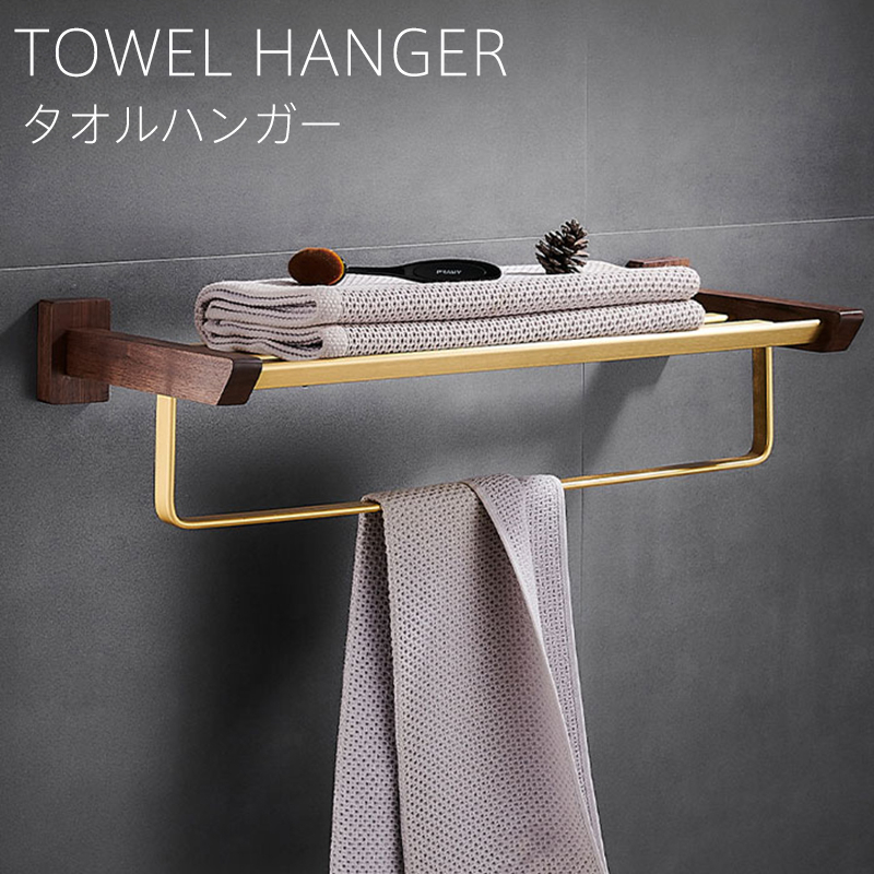 小物を置く棚が付き、スチール×木目のシンプルデザインタオルハンガー 木製 真鍮 タオル掛け 洗面所 ラック付き タオルホルダー 壁 棚付き バスタオルハンガー