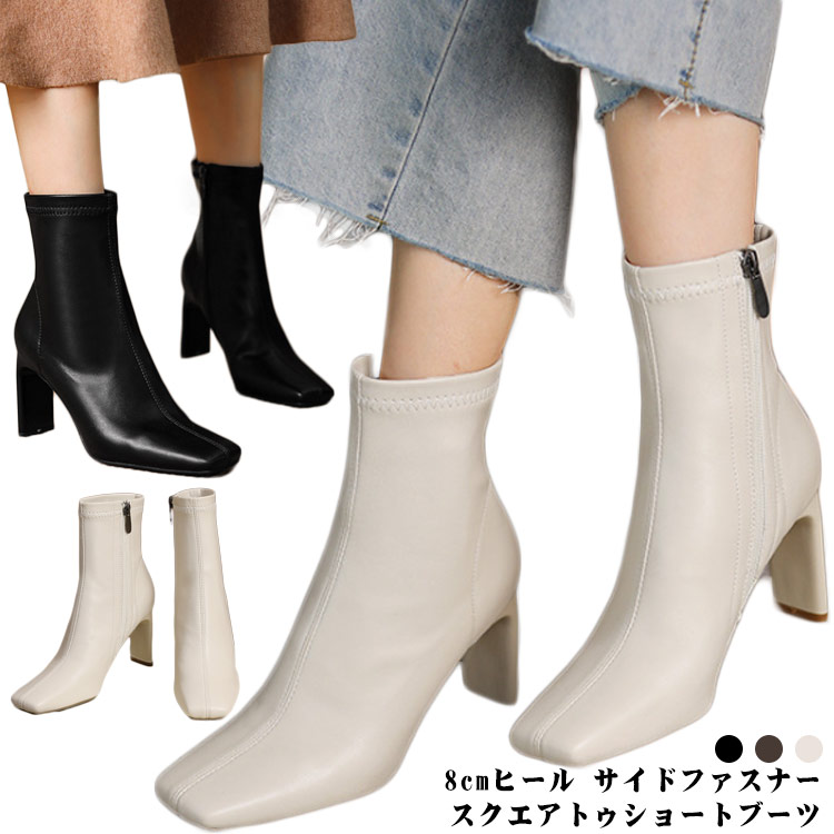 ショートブーツ レディース スクエアトゥ 8cmヒール ブーティ サイドファスナー 歩きやすい ヒール 痛くない 疲れにくい ショート丈 秋 冬