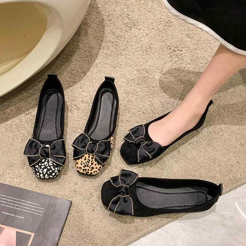 韓国 靴 シューズ 春夏 秋冬 レディース かわいい おしゃれ レトロ フラット 弓 シングル シューズ 女性用 春 ソフトレザー ソフト ソール ヒョウ柄 スクープ シューズ 作業靴