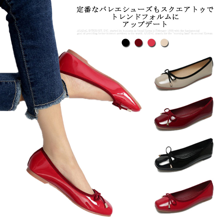 バレエシューズ フラットシューズ ぺたんこ レディース ローヒール スクエアトゥ 大きいサイズ 小さいサイズ ブラック 黒 エナメル 大人