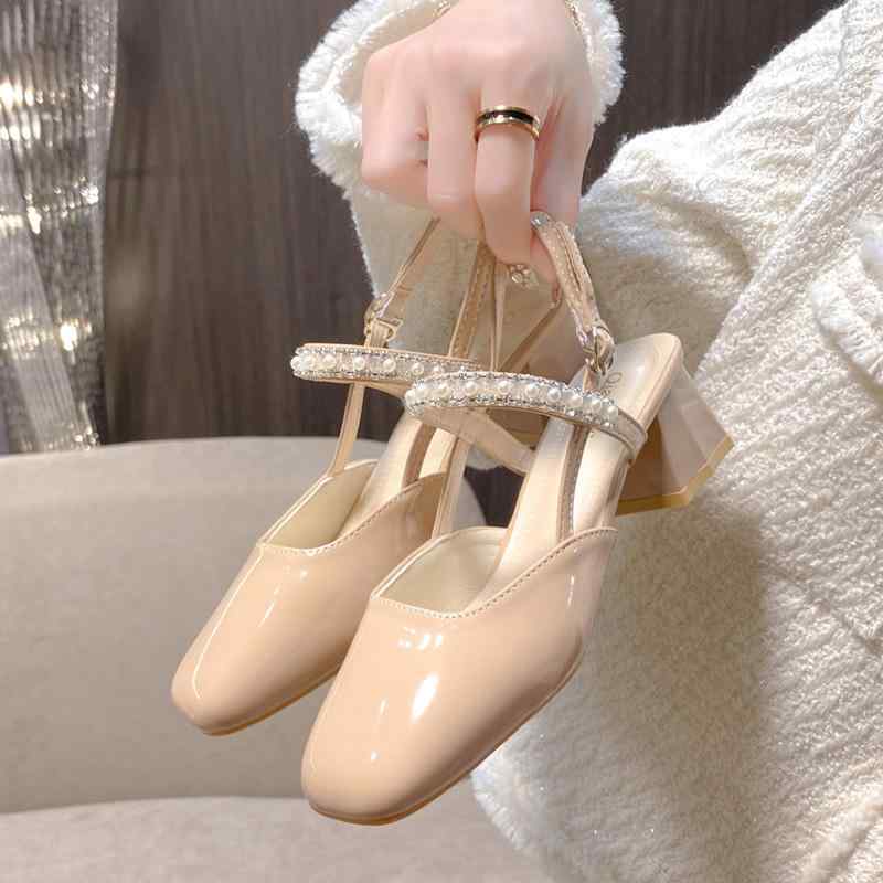韓国 靴 シューズ 春夏 秋冬 レディース かわいい おしゃれ メアリージェーン 靴 サンダル 女性用 夏 ファッション パール 一文字 太ヒール シングル シューズ