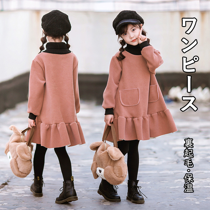 タートルネックワンピース 子供服 女の子 裏起毛 両面起毛 長袖 厚手 キッズ ハイネック ポケット付き 切り替え 重ね着風 ドッキング 保温 防寒 暖かい 柔らかい 快適 お出かけ
