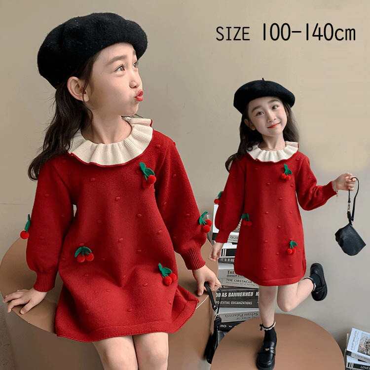 ニットワンピース キッズ 女の子 こども 子ども服 長袖 ワンピ ガーリー カジュアル ウエストゴム フリル おしゃれ 可愛い かわいい