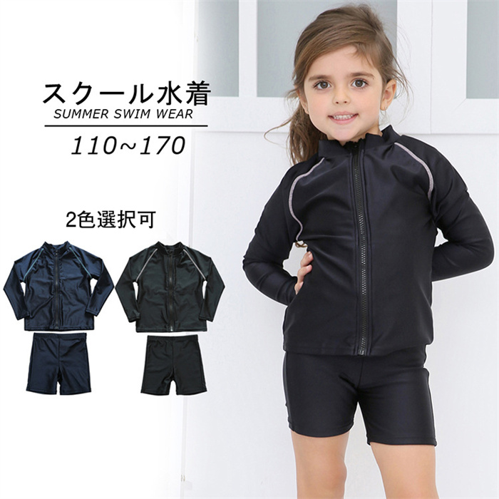 キッズ スクール水着 女の子 長袖 セパレート型 子ども用 スイムウェア ブラック ネイビー 小学生 女子 女児 水泳 スイミング プール 学校 授業 体育 子供 黒 紺