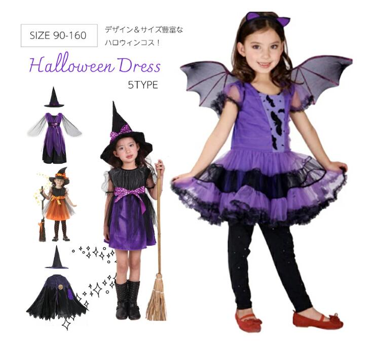 ハロウィン 衣装 子供 魔女 パープル オレンジ 安 安い パープルドレス オレンジドレス セット 帽子 帽子付き 仮装 かぼちゃ 蝙蝠 バット 蜘蛛 スパイダー 舞台 文化祭