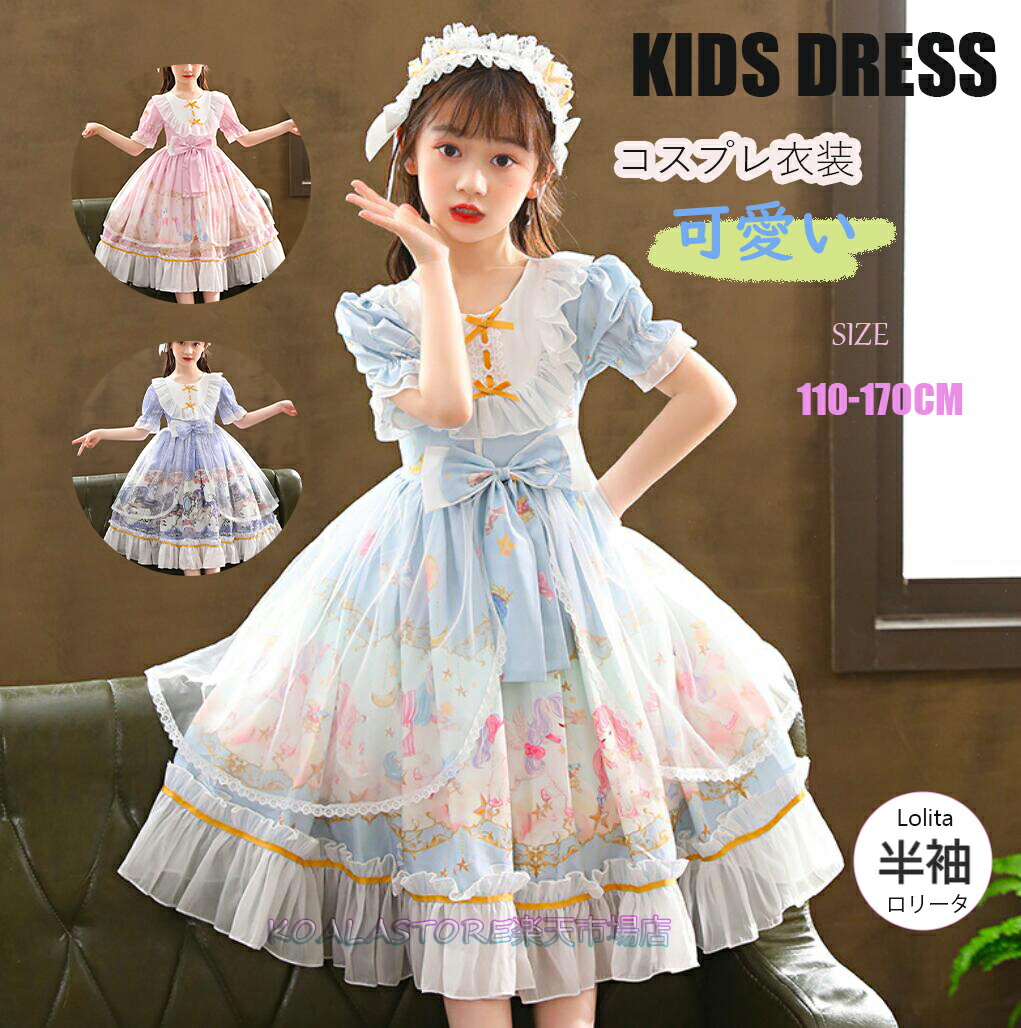 ロリータワンピース 子ども半袖ワンピース 子供ロリータ服 キッズドレス チュール フリル 甘ロリータ プリント柄 姫様ドレス ジュニア コスチューム 発表会 パーティー 誕生日 演奏会