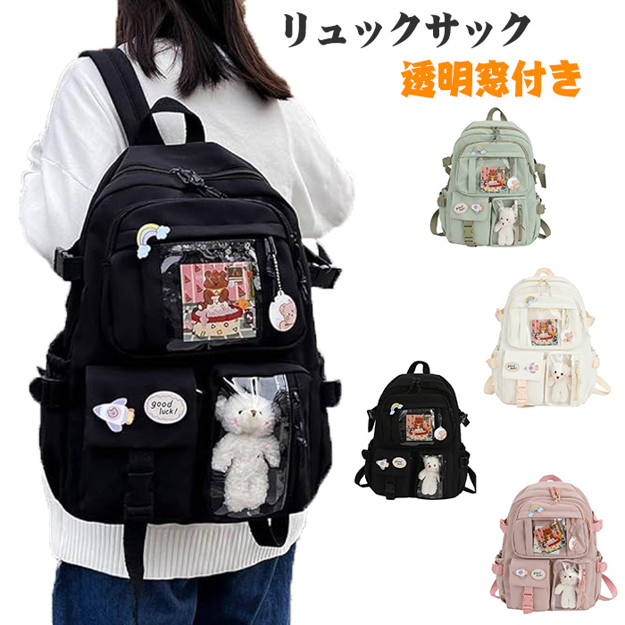 リュック レディース バックパック 高校生 おしゃれ 防水 クマ 透明窓付き 男女兼用 肩掛けバッグ ブラック 撥水 通勤 通学旅行遠足 出張 飾り物付き
