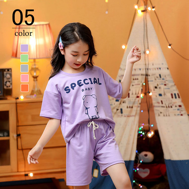 ルームウェア パジャマ 半袖 半ズボン 夏 キッズ 子供 ジュニア 全5色 部屋着 上下セット クマ ボタンなし 綿 コットン 通気性 ゴム 男の子 女の子 ボーイズ 100 110 120 130
