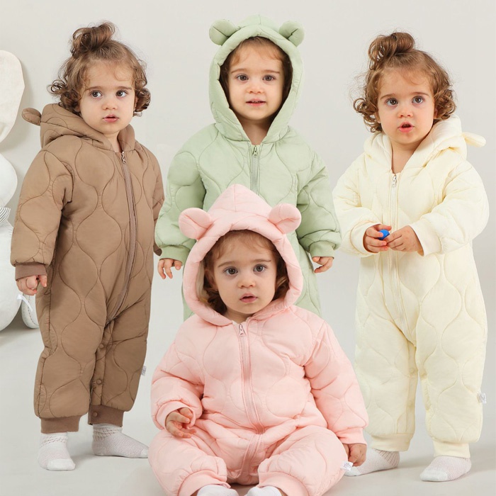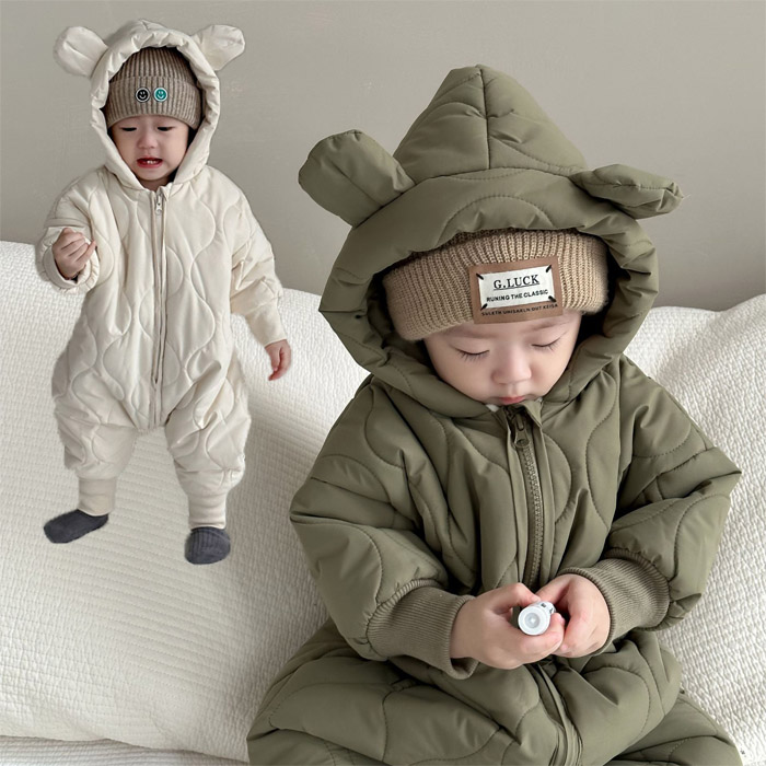 裏ボアベビーロンパース ジャンプスーツ ダウンコート キルティングコート フード付き アウター 歩行服 女の子 男の子 厚手 かわいい 暖かい 防寒 秋冬 幼稚園 出産祝い