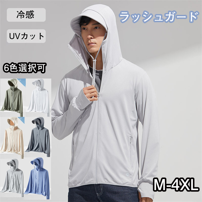 ラッシュガード パーカー 冷感 メンズ 長袖 薄手 指穴 夏 涼感 フード付き つば取り外し可能 おしゃれ 吸水速乾 アウター 日焼け止め服 接触冷感 無地 対策