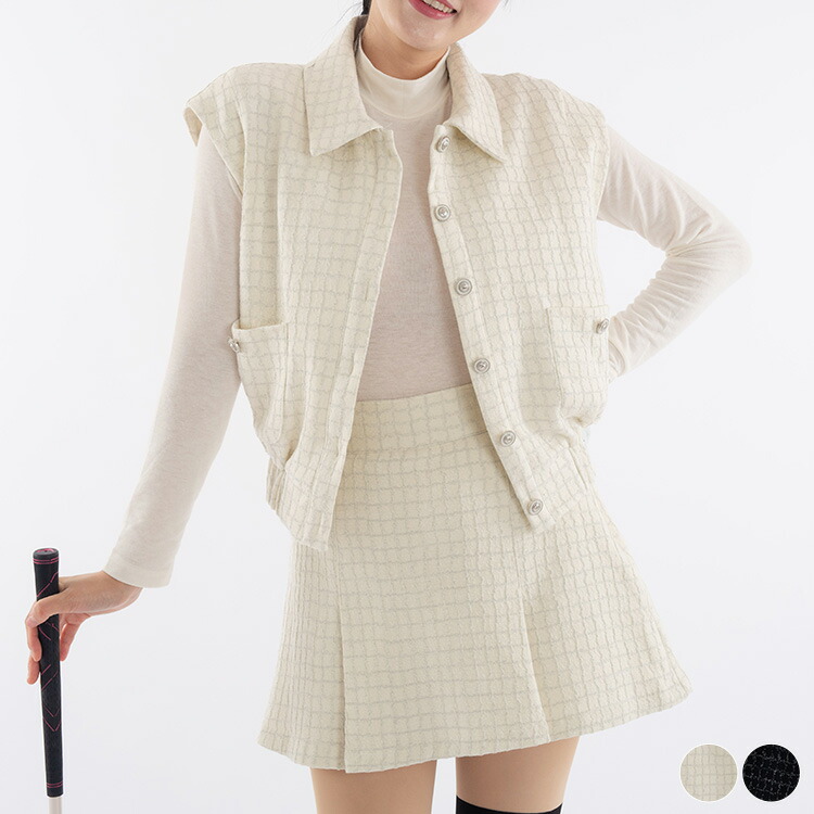 ゴルフウェア セットアップ レディース 韓国 ベスト スカート ライン 秋冬 ラメ 柄 秋 冬 黒 白 ミニスカート 襟付き ツイード チェック柄 おしゃれ ゴルフ女子 大人 ゴルフ スポーツ テニ