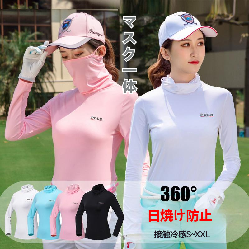 ゴルフシャツ UVカット ひんやり マスク一体 ネックカバー付き 耳かけ 長袖 日焼け防止 接触冷感 夏 ハイネック ゴルフインナ インナーシャツ レディース Tシャツ通気 吸汗 速乾 薄手 ヨガ