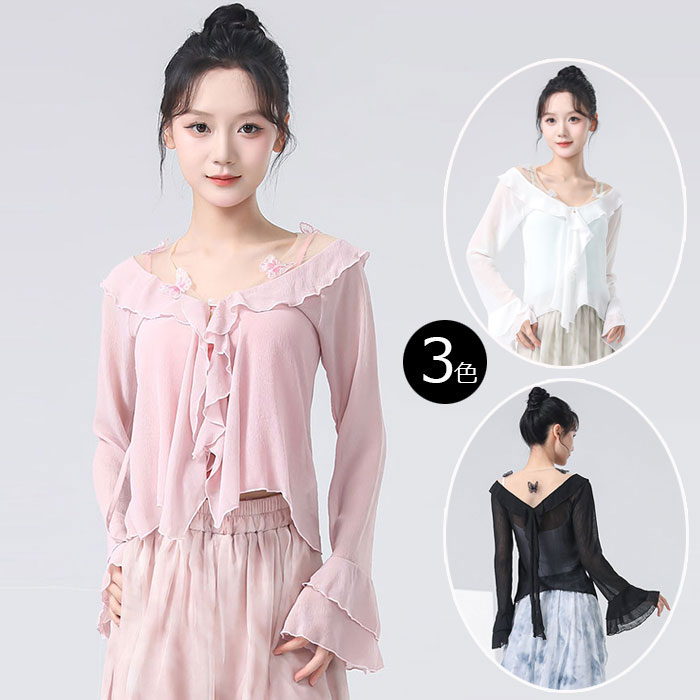 ダンス衣装 長袖 メッシュ トップス ロング丈 シフォン ガウチョパンツ ワイド パンツ フレアスカート 美しい 蝶 ふんわり シフォン パンツ ダンス レッスン着 レディース 大人 ダンス 発表会