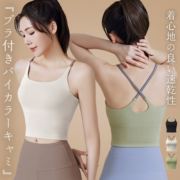 シンプルだけどバイカラーでお洒落に決まるカップ付きキャミソール♪ ヨガ トップス ショート丈 フィットネスウェア 女性 大人 カップ入 お洒落 可愛い 伸縮性 トレーニング