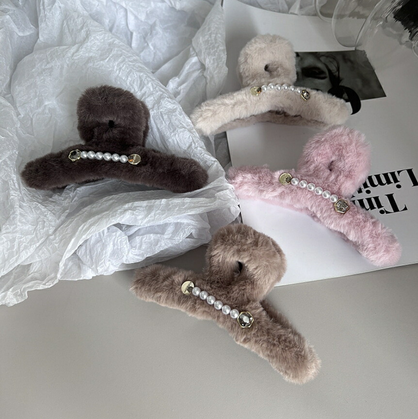ファーバンスクリップ パール付きバレッタ ビジュー モコモコヘアクリップ シンプル ふわふわ クリップ 大人可愛い 秋冬 レディースヘアアクセサリー