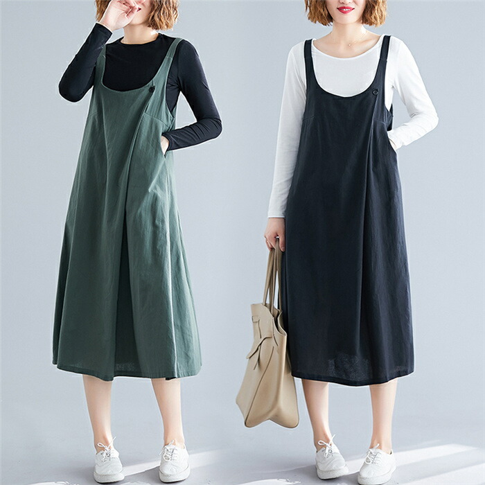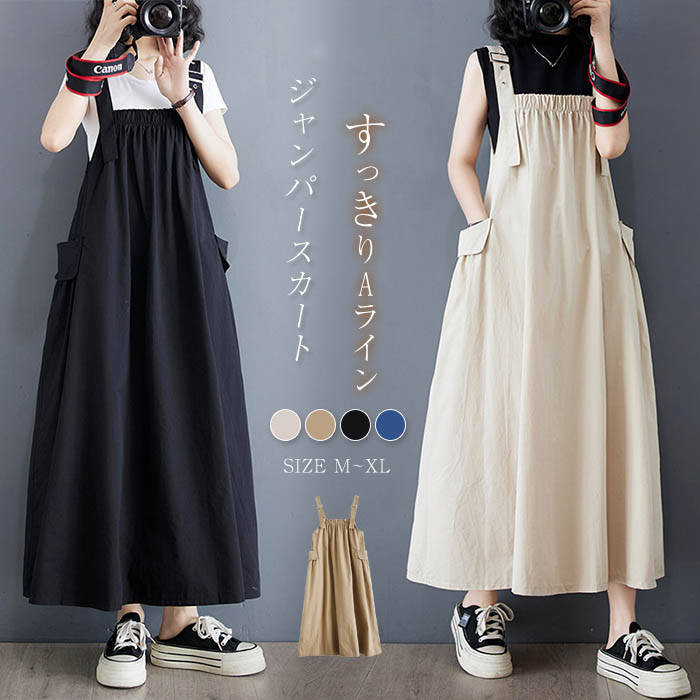 ジャンパースカート 大人 ロング 黒 春 夏 綿麻混 サロペット スカート ジャンパー スカート サロペット ワンピース レディース サロペットスカート オールインワン aライン フレア