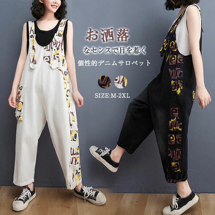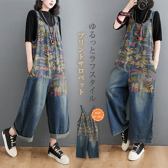 サロペット レディース 春 秋 サロペット パンツ レディース サロペット デニム 大きいサイズ プリント サロペットパンツ 花柄 ワイドパンツ 大人 オールインワン