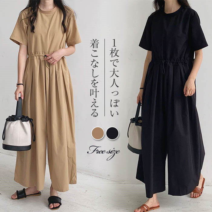 つなぎ レディース 半袖 オールインワン レディース ドッキング オーバーオール サロペット レディース クールネック ワイドパンツ ロングパンツ ギャザー