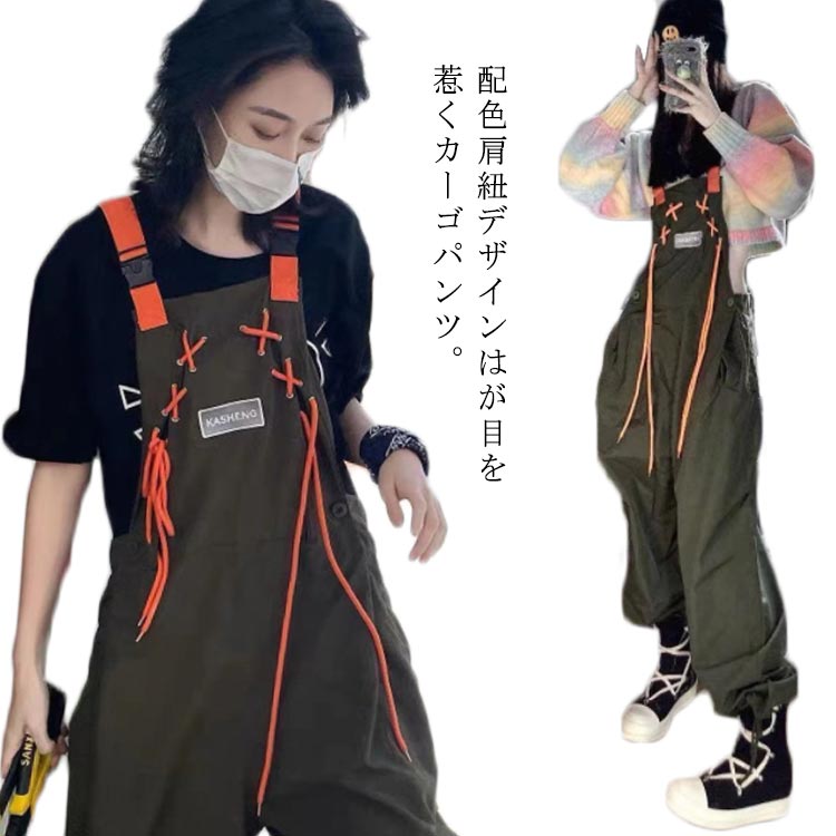 配色肩紐がワンポイント ユニセックス サロペット カーゴパンツ HIPHOP K-POP ヒップホップ 衣装 ダンス ボトムス オールインワン カーキ