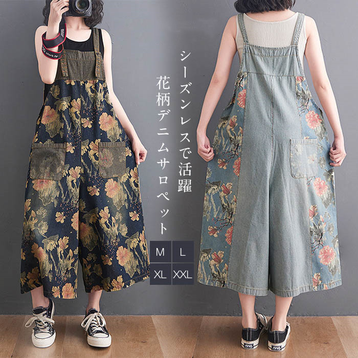 デニムサロペット レディース サロペット パンツ レディース デニム ワイドパンツ 大きいサイズ ボトムス サロペット 花柄 大人