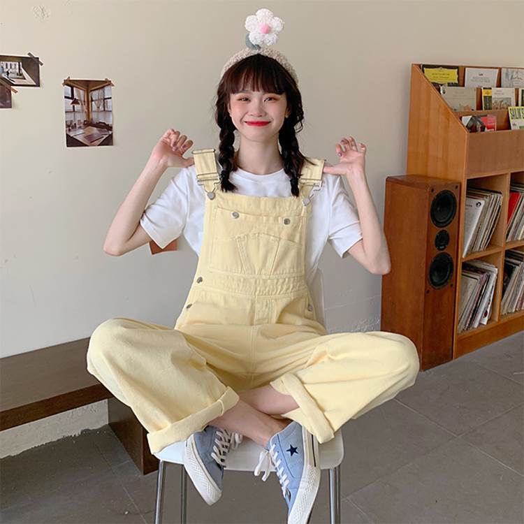 デニム オーバーオール サロペット レディース 個性的 無地 黄色 S M L 春 夏 秋 パステルカラー シンプル カジュアル ベーシック アメカジ ストリート 体型カバー ラフ