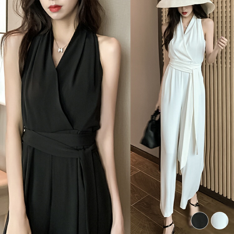 サロペット レディース ノースリーブ オールインワン セクシー Vネック ホルターネック ワイドパンツ ウエストマーク エレガント おしゃれ クール ホワイト