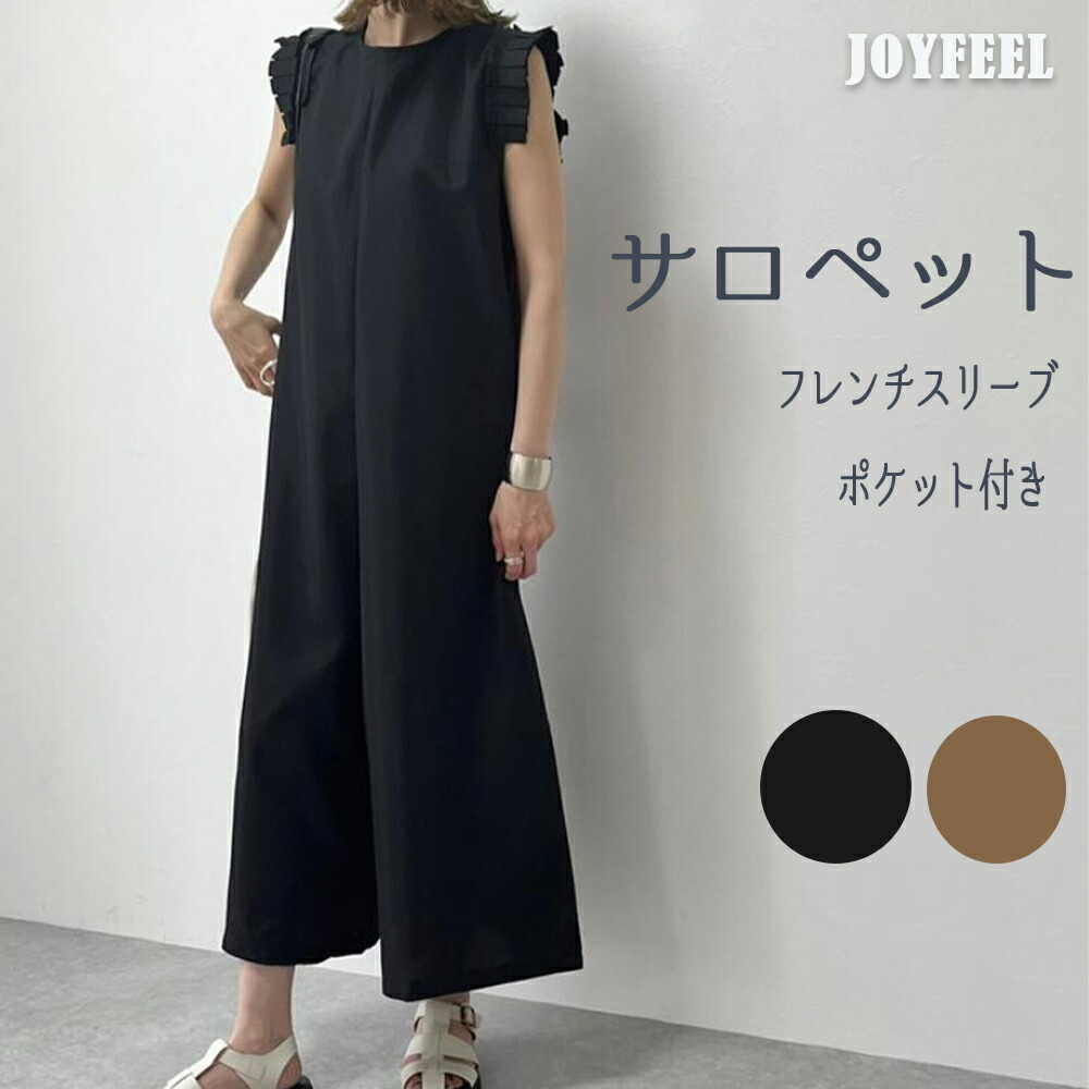 オールインワン フリル フレンチスリーブ サロペット レディース 服 パンツ フリル袖 ポケット ファスナー リゾート ラッフル 肩 ノースリーブ 体型カバー -