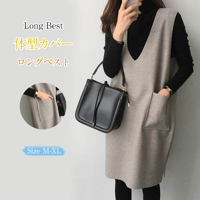サロペットレディースチュニックベストロングベストノースリーブジャンパースカートタンクトップ膝丈ポケット付きVネックオールインワン