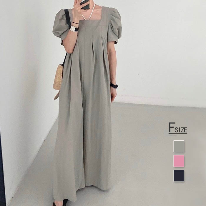 つなぎ レディース 半袖 オールインワン レディース スクエアネック オーバーオール サロペット ガウチョパンツ パフスリーブ ワイドパンツ ロングパンツ タック タックパンツ
