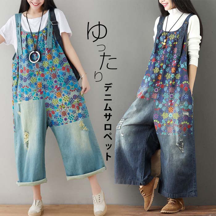 デニムサロペット デニム レディース オールインワン ワイドパンツ 花柄 春 秋 デニムサロペット パンツ ロング 大人 可愛い 大きいサイズ ゆったり
