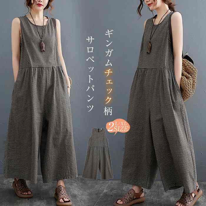 サロペット レディース 春秋 春 秋 サロペットパンツ コットン パンツ ワイド リラックス ギャザー ノースリーブ クルーネック aライン チェック チェック柄 楽ちん 20代 30代 40代 50