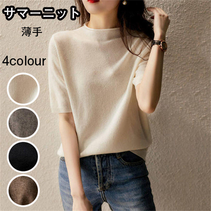 トップス レディース プチハイネック サマーニット 半袖 薄手 きれいめ ブラウス 上品 通気性 レディース freesize 春 夏 秋