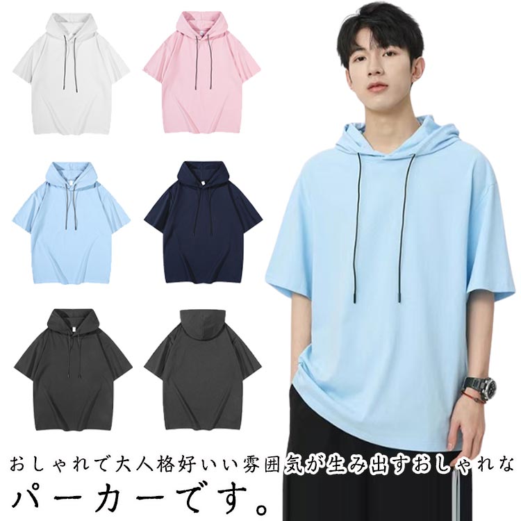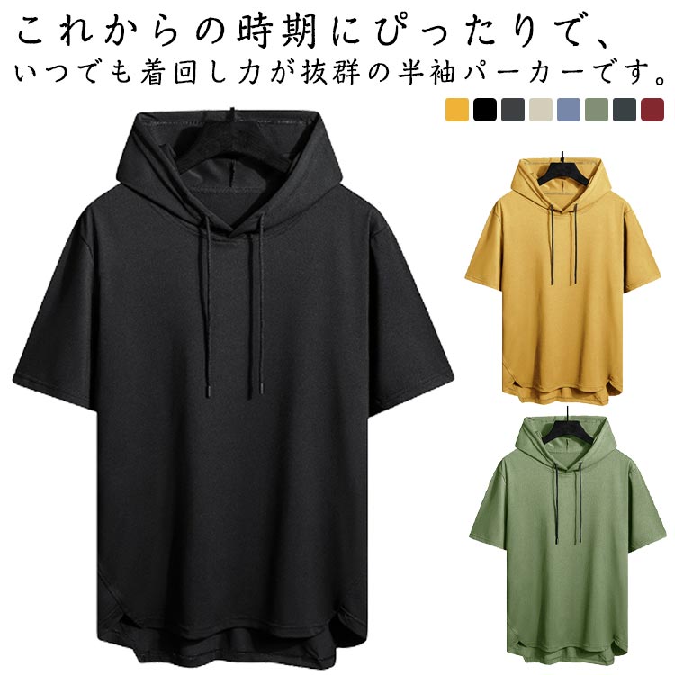 メンズ 春夏 半袖 薄手 パーカー プルオーバー フード付きTシャツ 無地 パーカーメンズファッション トップス パーカー